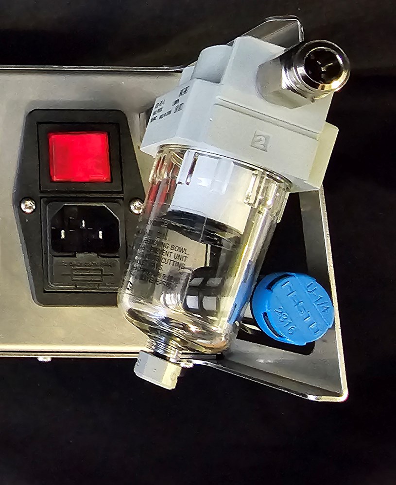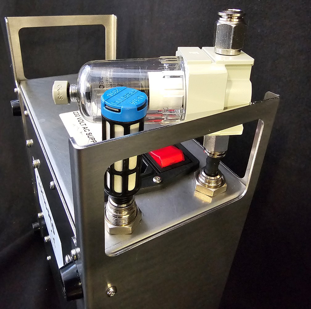 Hephaestus U2 Stainless Steel cabinet housing the Alagonia pump. Further one Sarpedon reservoir next to Alagonia stabilizing the pressure or vacuum. Gauges on Sarpedon help controlling pressures. The two Riegler 1.2 Bar pressure regulators visible on Sarpedon front.