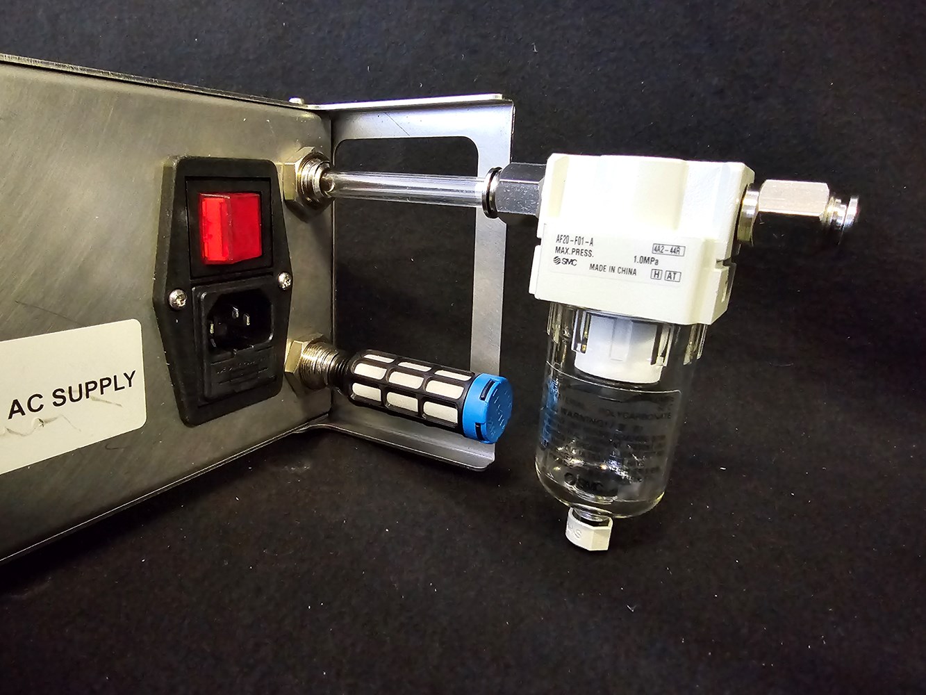 Alagonia-8 used to compress air will condense moisture from the surrounding air. Its a must to instal a trap between the inlet filter and Alagonia-8 inlet for protection of internal pressure sensors.