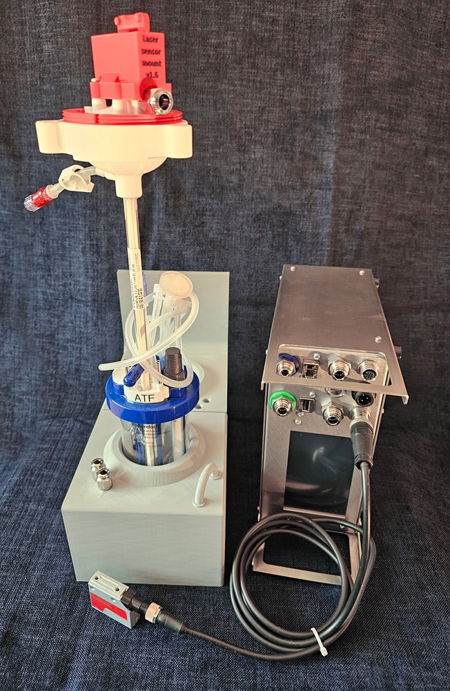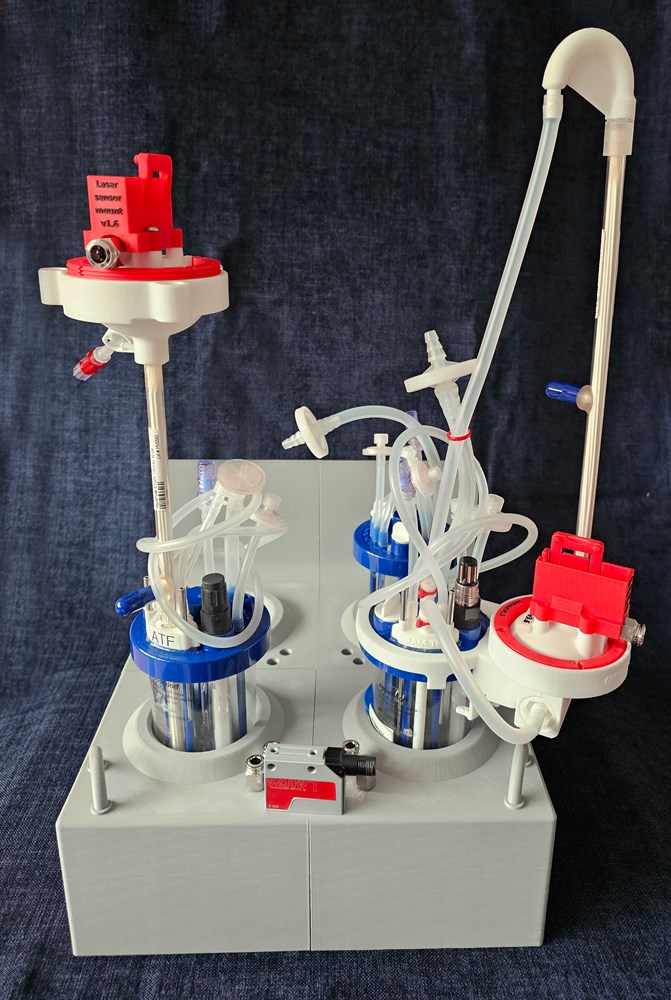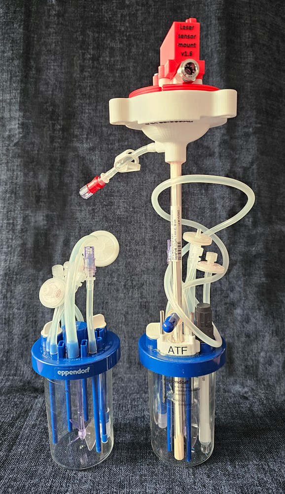 Left photo shows standard bioBLU 0.3 batch SUB converted to CellRetention-300 ATF P-SUB. Center photo one std bioBLU and one CellRetention-300 with the blue head plate and the inverted Thalia TM80 on top of the HFF. Right photo ATF and Clotho Drive Unit and LASER sensor in front of the DASbox dummy