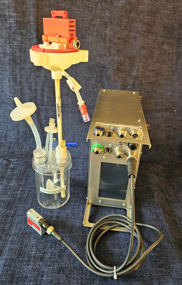 Left photo: CellRetention-500 ATF with customized SepraPor HFF and TM80 SUP. Red LASER sensor mounted in a Re-Usable-Bracket above the dome of the Thalia M80 A-SUE. Centre photo: Clotho Drive Unit requires only the cable to the LASER and SUP drive gas to drive the Thalia A-SUE.
