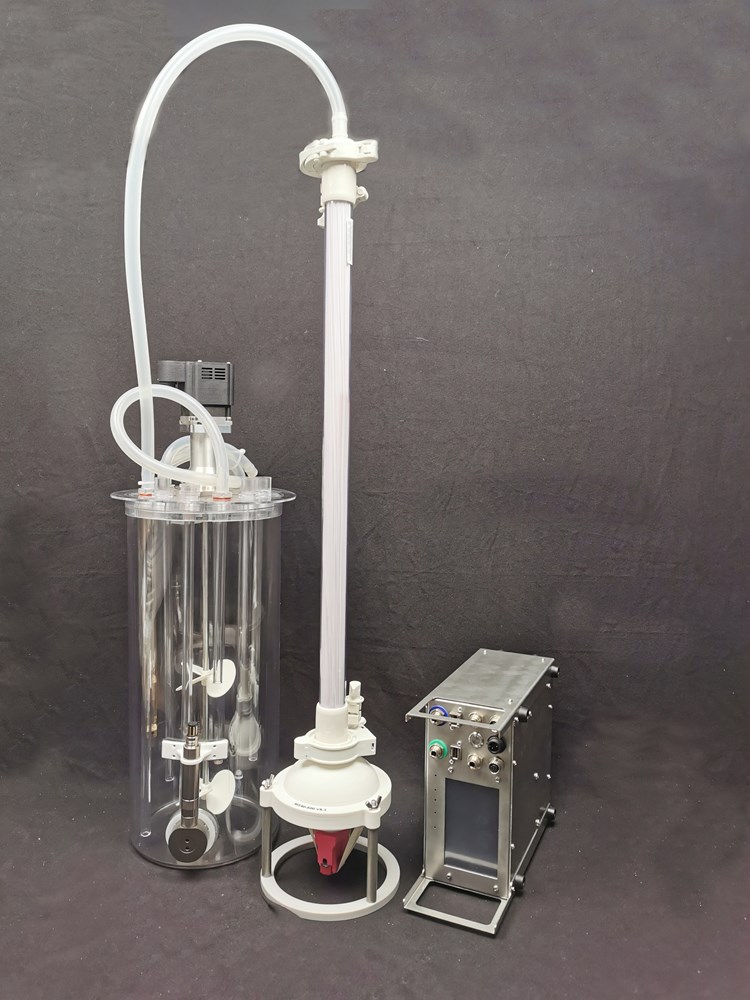Shown 3 and 6 liter P-SUBs with Magnetic-Bottom-Drive, controlled diaphragm A-SUP connected to TC type HFF. The customizable SUB suction deep-tube connects via a hose to the standard HFF top at feed side and opposite to the A-SUP. The A-SUP is mounted on a foot, and underneath the SUP the red LASER sensor for real-time measuring the position of the diaphragm and hereby full control of velocity and selected exchange volume.