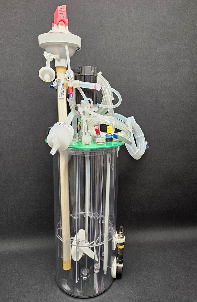 The SUBmerged OD200 mm 13 liter P-SUP with Thalia TM100 mounted inverted on the SepraPor C224 HFF. The red LASER sensor in real-time measure the position of the diaphragm for unique operation. Hereby full control of velocity and selected exchange volume of broth. Pre-assembled P-SUBmerged-13 with InCyte bio-mass, VisiFerm and Oneferm.