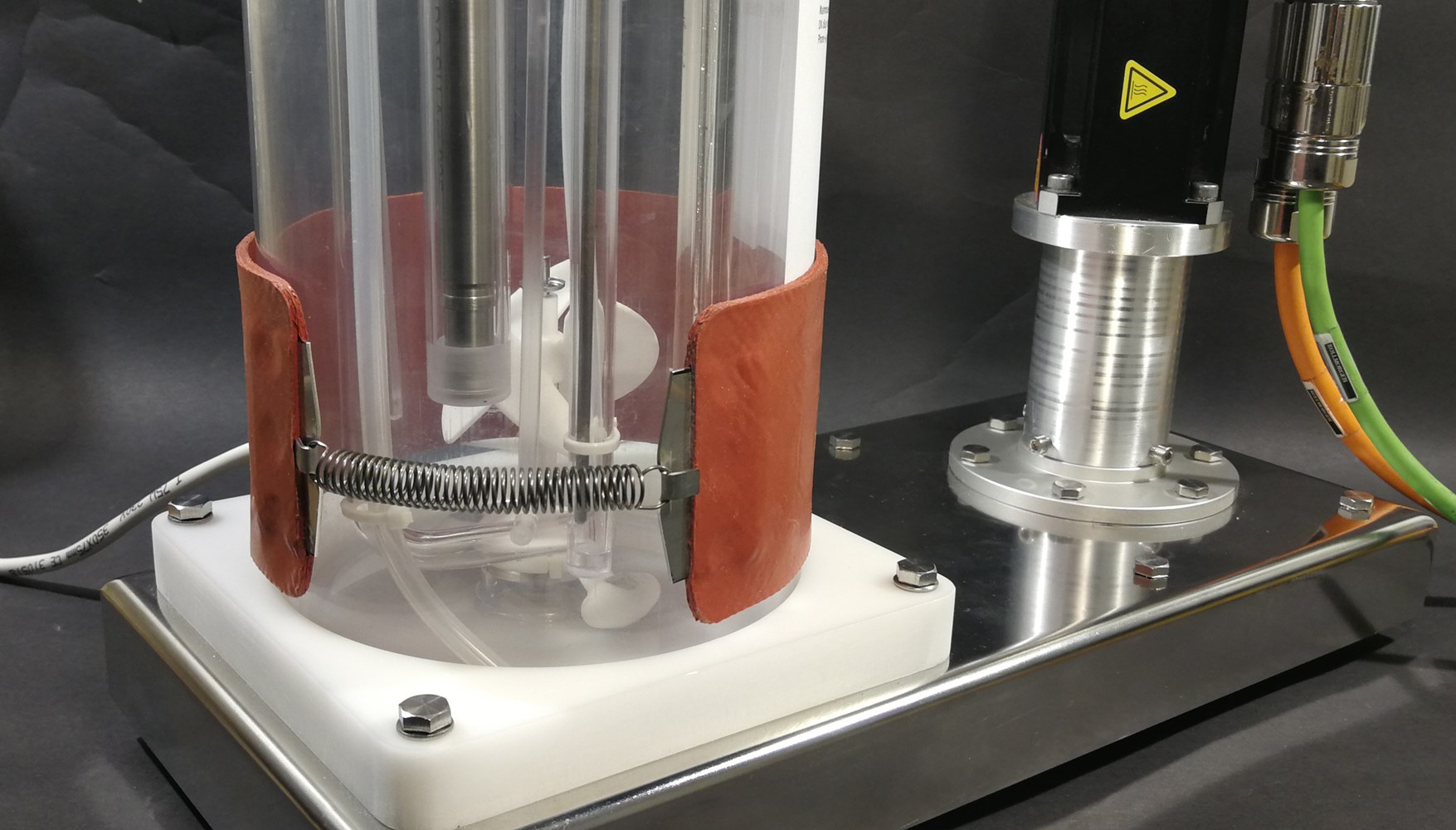 Left photo - The re-invented 3 liter P-SUB with SUBmerged SepraPor C112 and inverted Thalia TM80 with red LASER support on top. Centre photo - The InCyte biomass SUS patch mounted on the vessel wall and InCyte ARC sensor clicked on. Right photo - 3 liter P-SUB is mounted in the Heating-Support-Foot (HSF) on the Magnetic-Stirrer-Table (MST). Reason is simple – there is not space for both servo motor, sensors and Thalia TM80 on the OD137 mm head plate so Magnetic-Bottom-Drive (MBD) required.