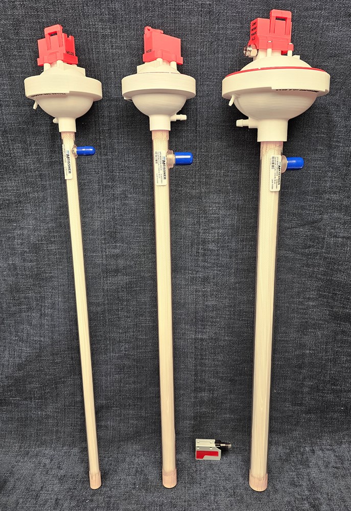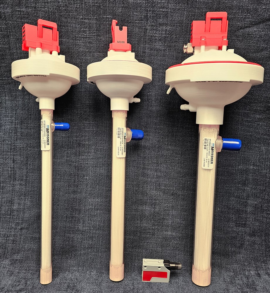 Left photo show short SUBmerged kits Thalia TM100 and TM140 each with 300 mm long SepraPor HFF. Center photo long SUBmerged kits Thalia TM100 and TM140 each with 600 mm long SepraPor HFF. Tiny LASER sensor seen as well. Photo to the right show the ball shaped TM200 A-SUP with SepraPor OD76 mm Direct-Fit connection.