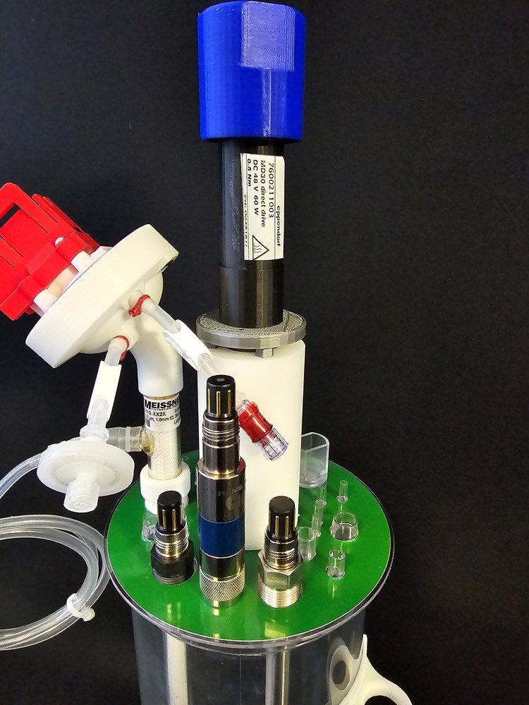 The 3.2 liter customizable B-SUB (Batch-Single-Use-Bioreactor) is equipped with a ID19 mm port closed with a plug in the head plate and thus able to operate also as a batch SUB. When this unique Batch-SUB needs to operate as a P-SUBmerged the "CellRetention-3-kit-x" is easily inserted though the ID19 mm port under the hood by end-user. Remember to pre-wett the HFF and ready to use.