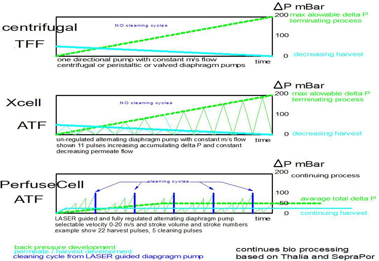 This simple chart illustrates differences in HFF conditions seen from pressure drop and fouling according to the chosen pump system.