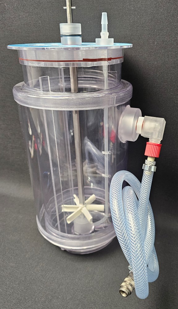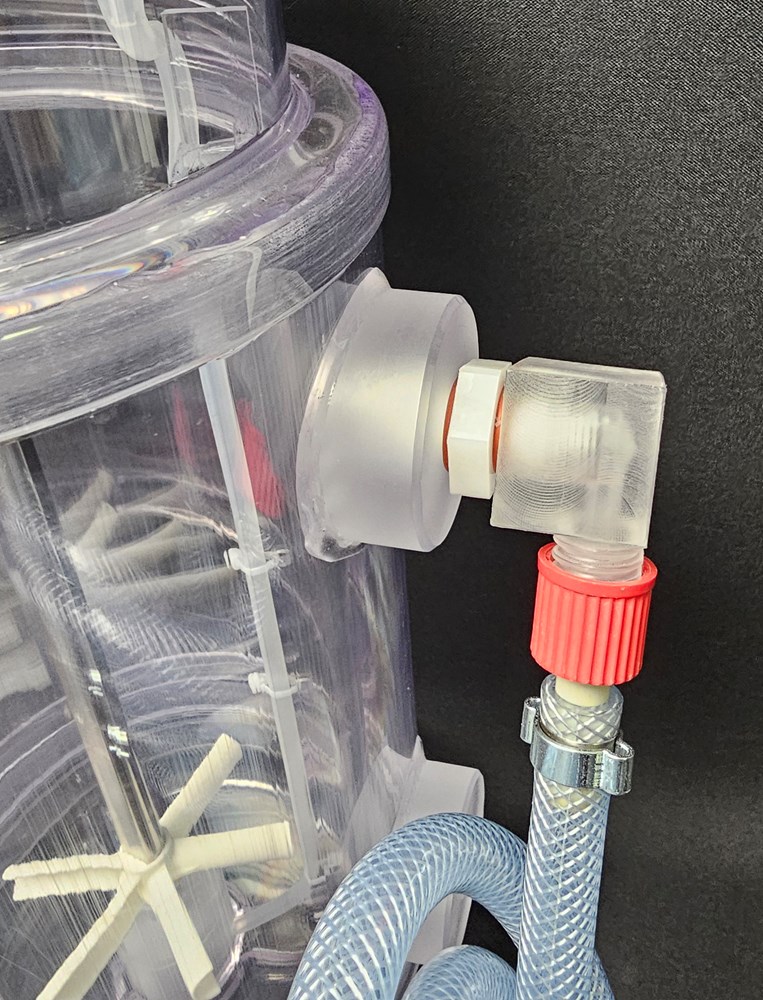 Seen here the OD137 mm B-SUB designed for liquid thermal control. Added is the additional Single-Use-Jacket (SUJ) with non-symmetrical arranged inlet - outlet. Keep inlet at bottom.